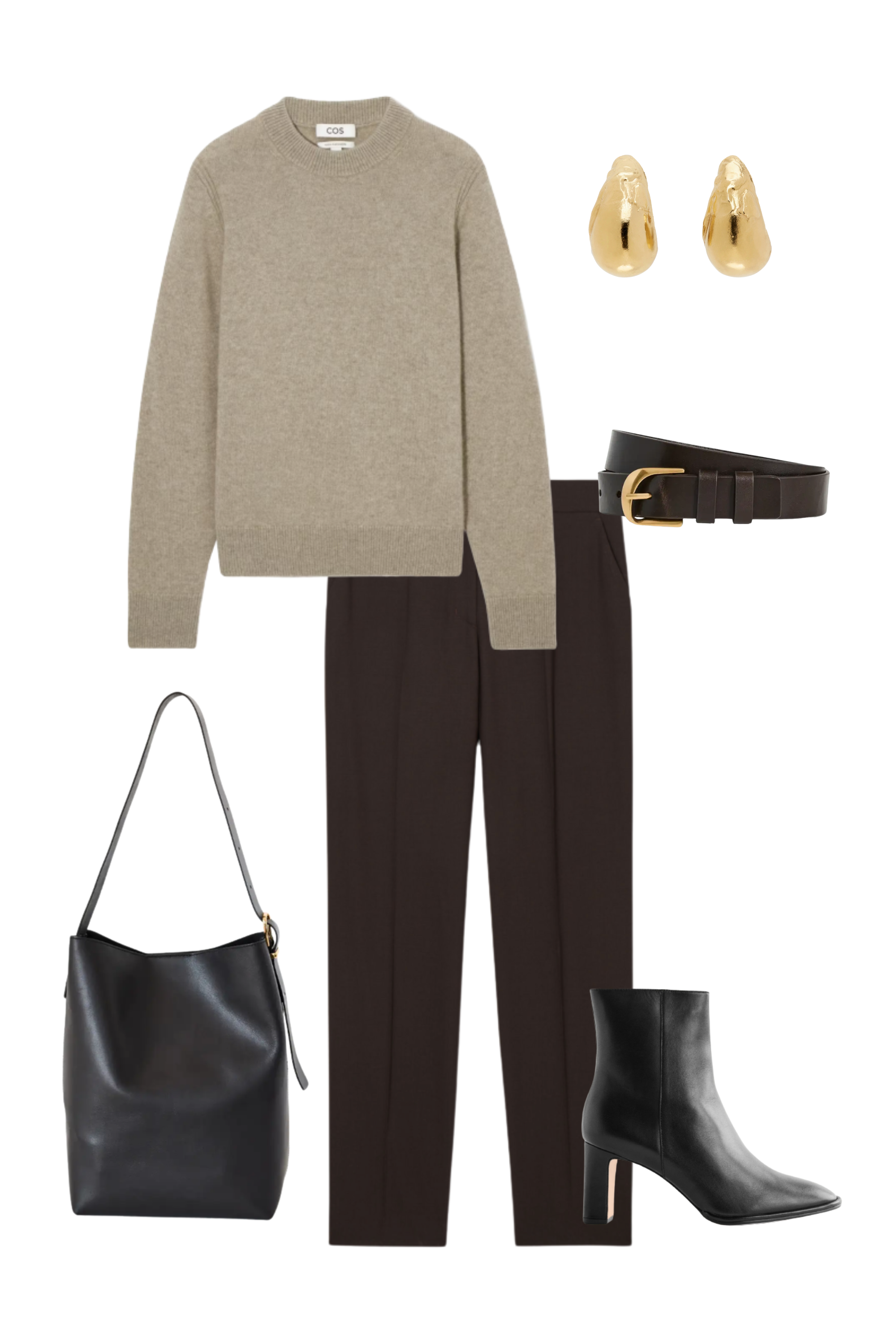 For a cozy day working at your favorite coffee shop, comfort is essential. Begin with the tailored trousers and layer on your crewneck sweater. Slip into ankle boots, and grab your tote bag, roomy enough for all of your work essentials. Accessorize with the brown belt and oversized earrings to complete your tonal outfit—perfect for a casual day at a café.