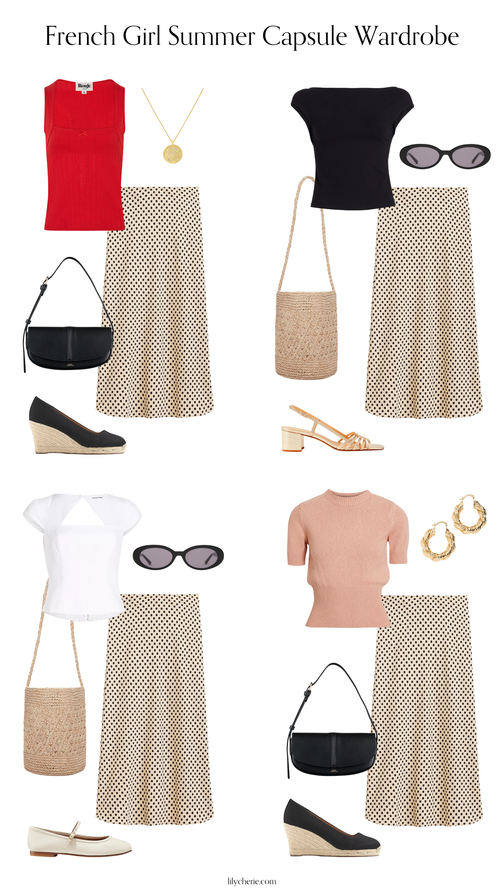 9. Polka dot slip skirt. Polka dots seem to be everywhere this season. Why not add a polka dot slip skirt to your French capsule wardrobe? This feminine piece is both timeless and stylish, making it a chic addition to your closet this summer. Pair it with simple tops like a white tee, a short-sleeve knit, or a tucked-in blouse - the neutral colors allow you to style it with almost anything.
