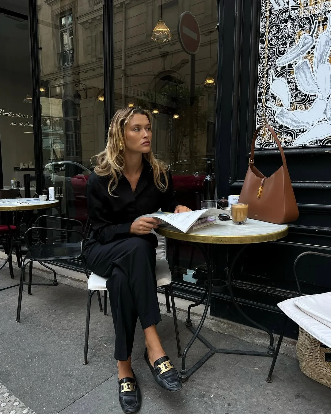 There’s nothing chicer than a monochrome moment. You can take inspo from this all-black ensemble by pairing a collared shirt with cropped trousers and a classic loafer. And you don’t have to stick with black either. Gray, beige, or chocolate brown, choose the hue that makes you feel your best. This is one of my favorite takes on French business casual.
