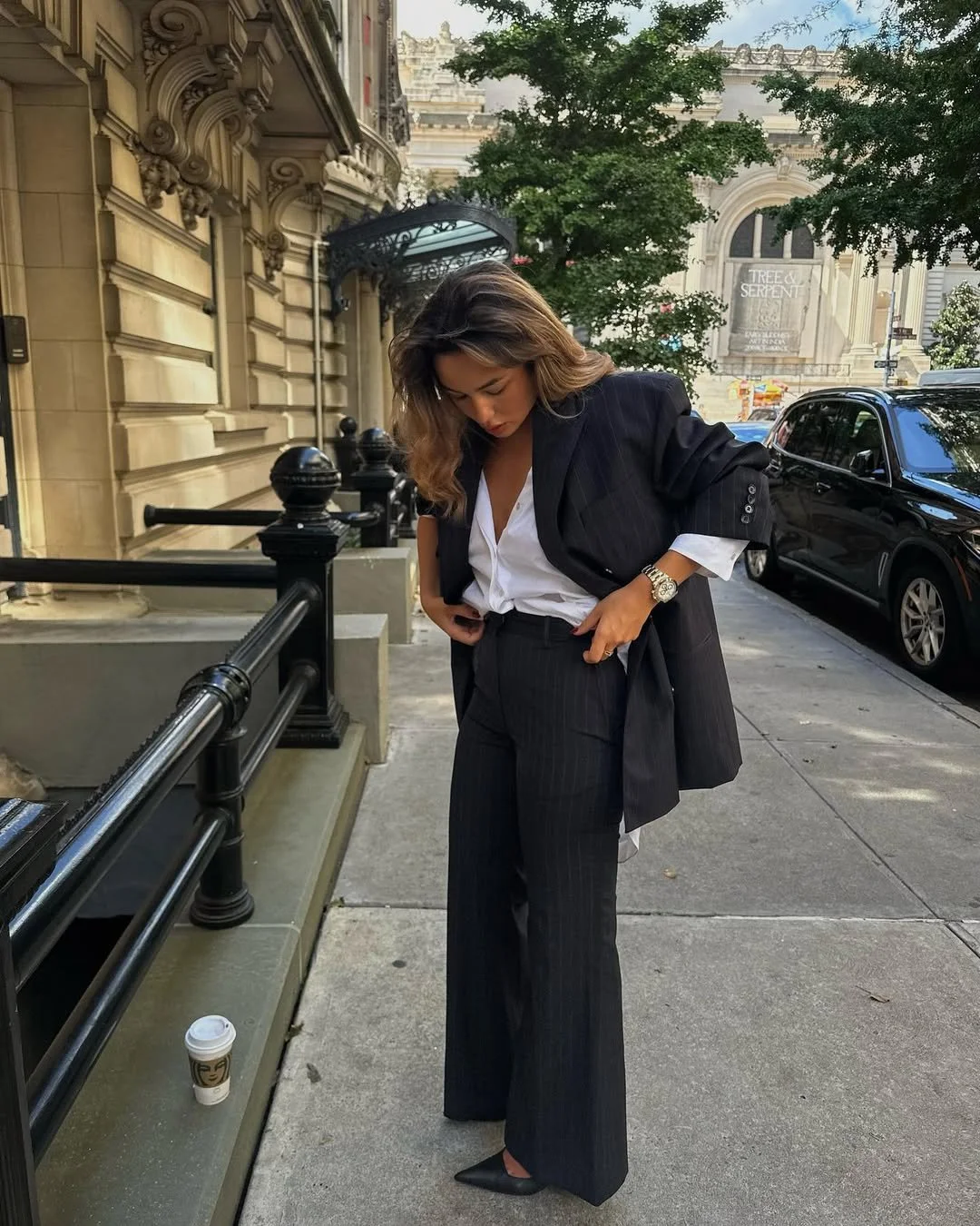 French tailoring is sharp but not severe. This navy blue pinstripe blazer and trousers make for a power look that doesn’t feel rigid. I love this with a white button-up shirt tucked in, finished with low-heeled pumps or ballerinas. In this look, you’ll effortlessly exude authority at your next big presentation.