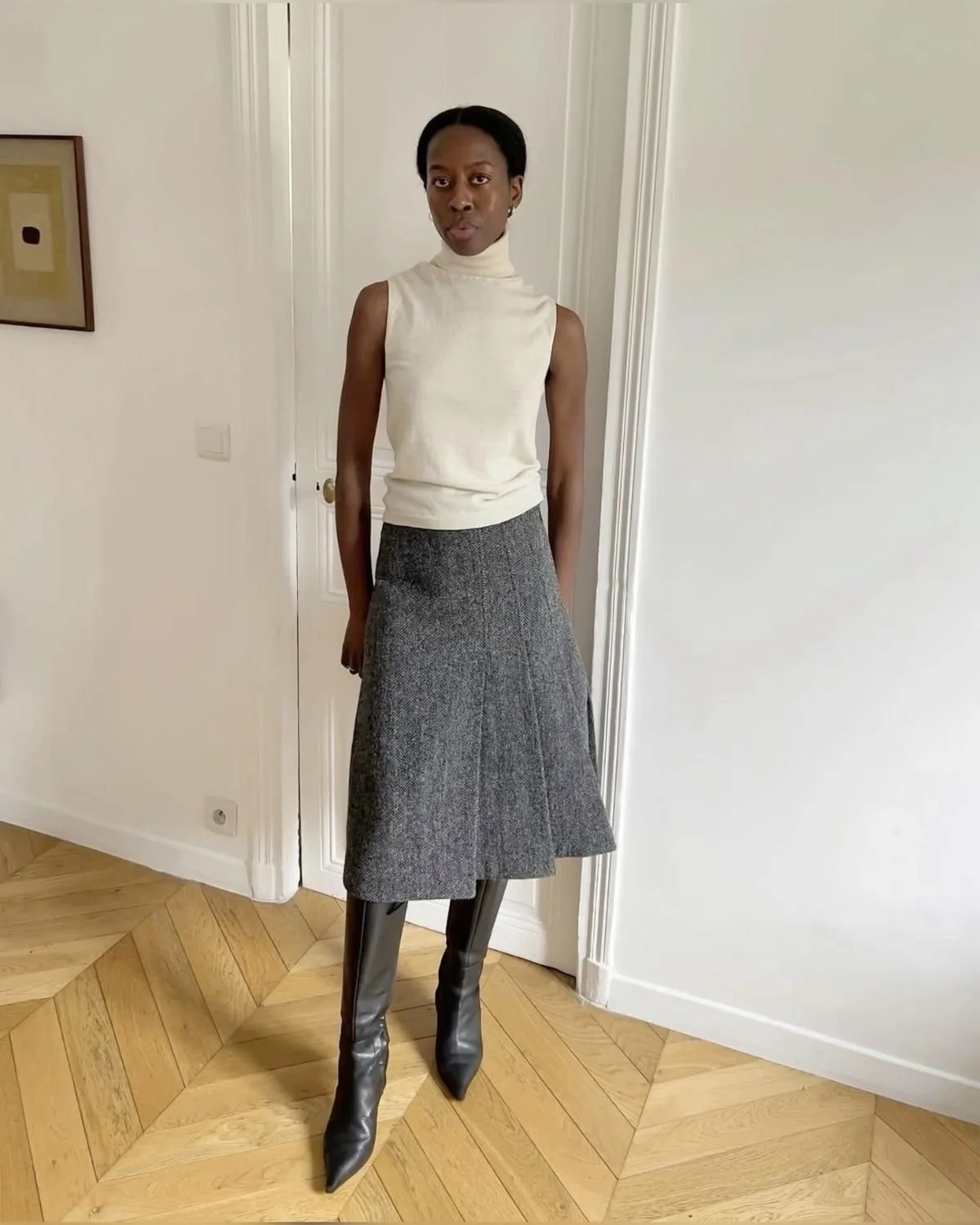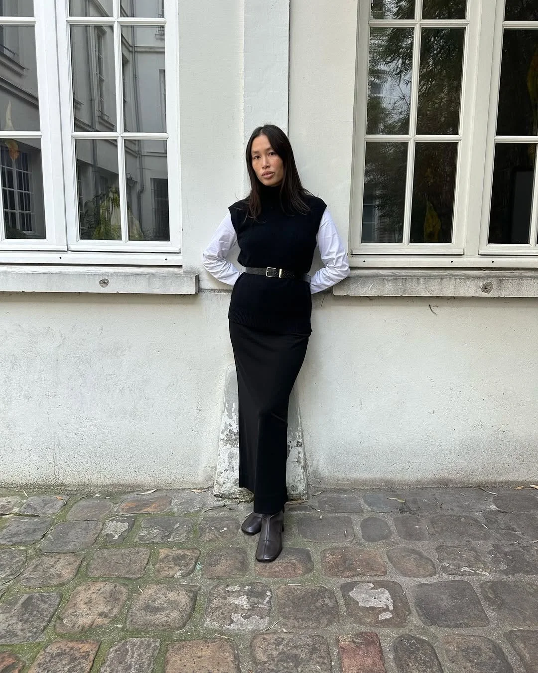 A nod to the nineties, this French girl fit is simple with all the right details. I’m obsessed with this sleeveless turtleneck knit for the office (of course, you can layer on a slim cardigan when the AC inevitably kicks in). With a long pleated skirt and knee-high boots, it feels especially office-ready. Finish with narrow frames and a minimalist tote if you want to fully lean into the siren mood.