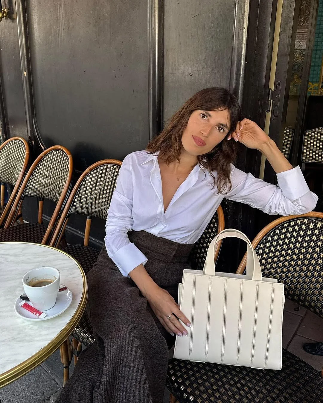 The forever office uniform. A crisp white shirt tucked into pleated trousers is simple, chic, and endlessly adaptable. Roll the sleeves, swap in a belt, or style with bold jewelry when you want it to feel different. Complete this combo with heels, loafers, or even ankle boots (especially around this time of the year). French women wear this on repeat, and for good reason.