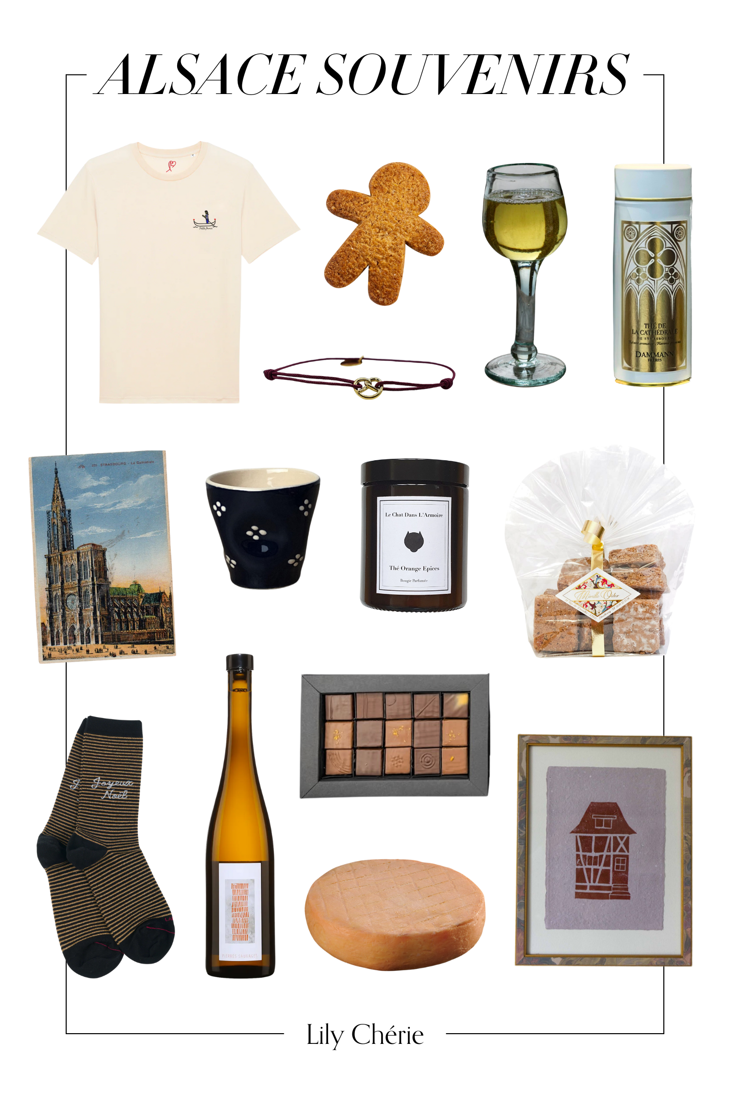 Ville de Cœur Petite France t-shirt | Maison Alsacienne de Biscuiterie biscuits | La Soufflerie All Over Alsace Transparent wine glass | Dammann Frères Strasbourg Cathedral tea | Carpe Diem bretzel bracelet | Poterie Lehmann espresso cup | Le Chat Dans l'Armoire candle | Mireille Oster gingerbread | Labonal Joyeux Noël socks | Vignoble du Reveur 'Pierres Sauvages' | Erithaj chocolate box | Maison Lohro Munster cheese | Lu Papeterie Alsatian house linocut