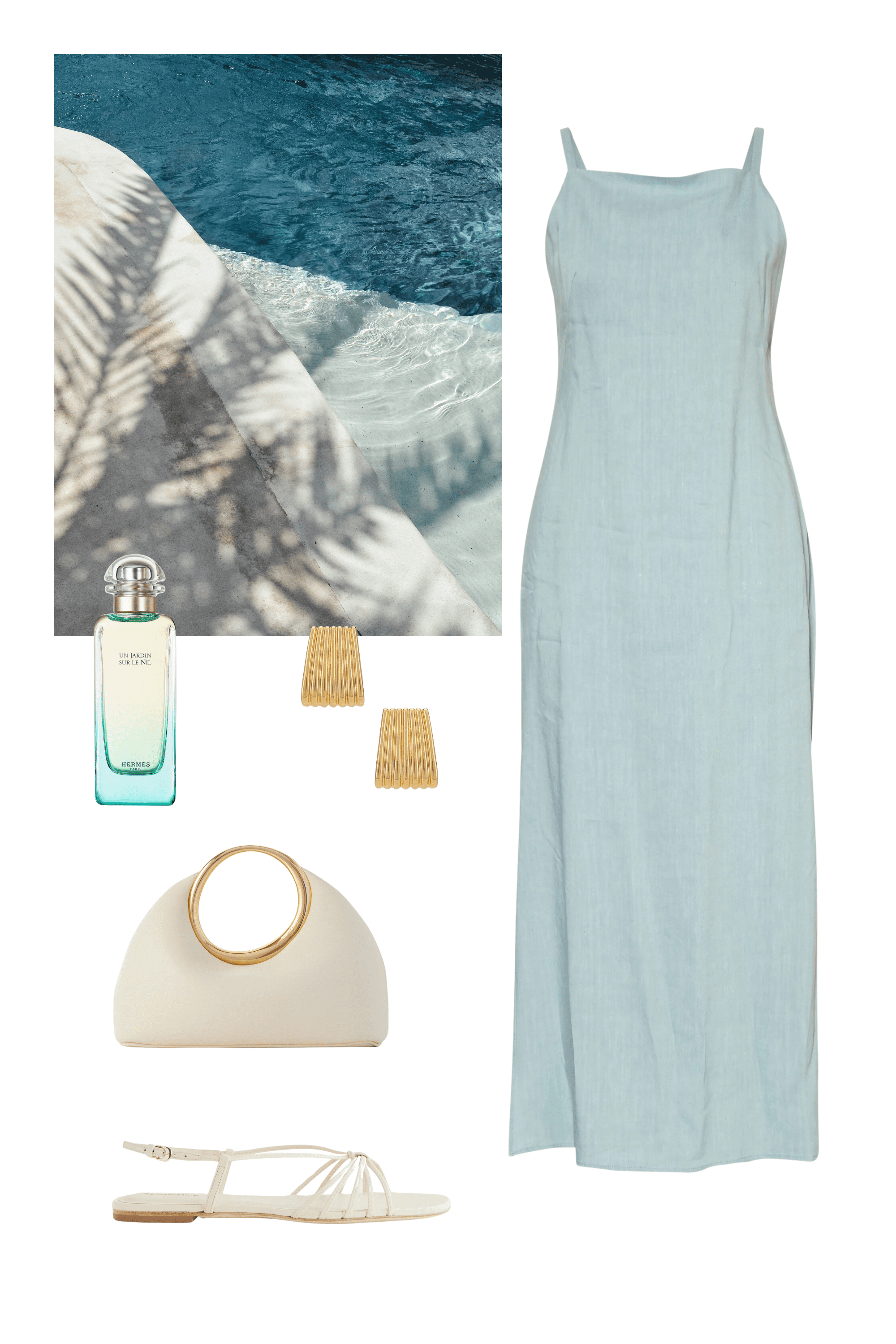 Maxi dress / Clutch / Strappy sandals / Earrings / Perfume