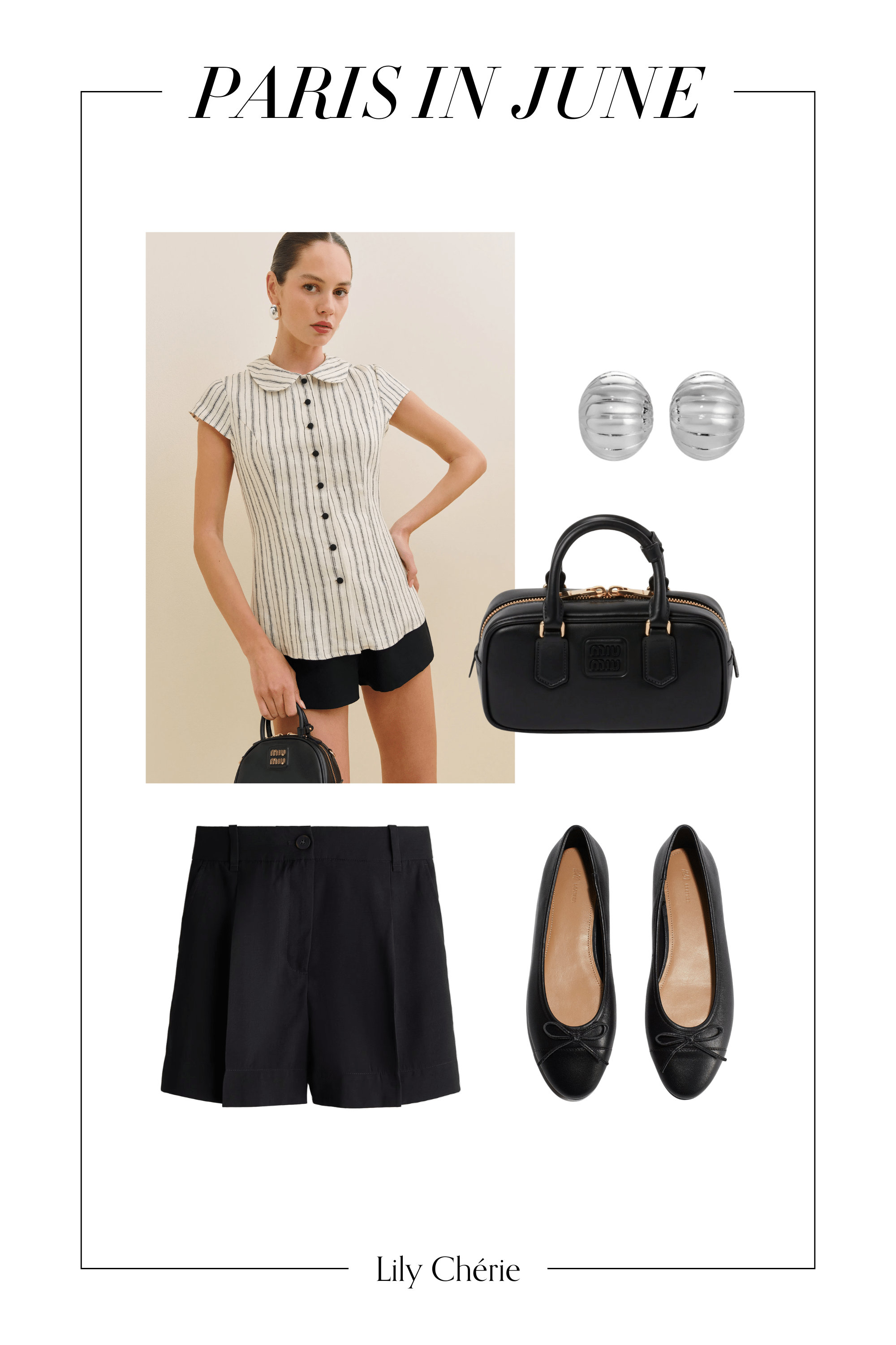 Striped shirt (similar) | Shorts | Top handle bag (similar) | Earrings (similar) | Ballet flats