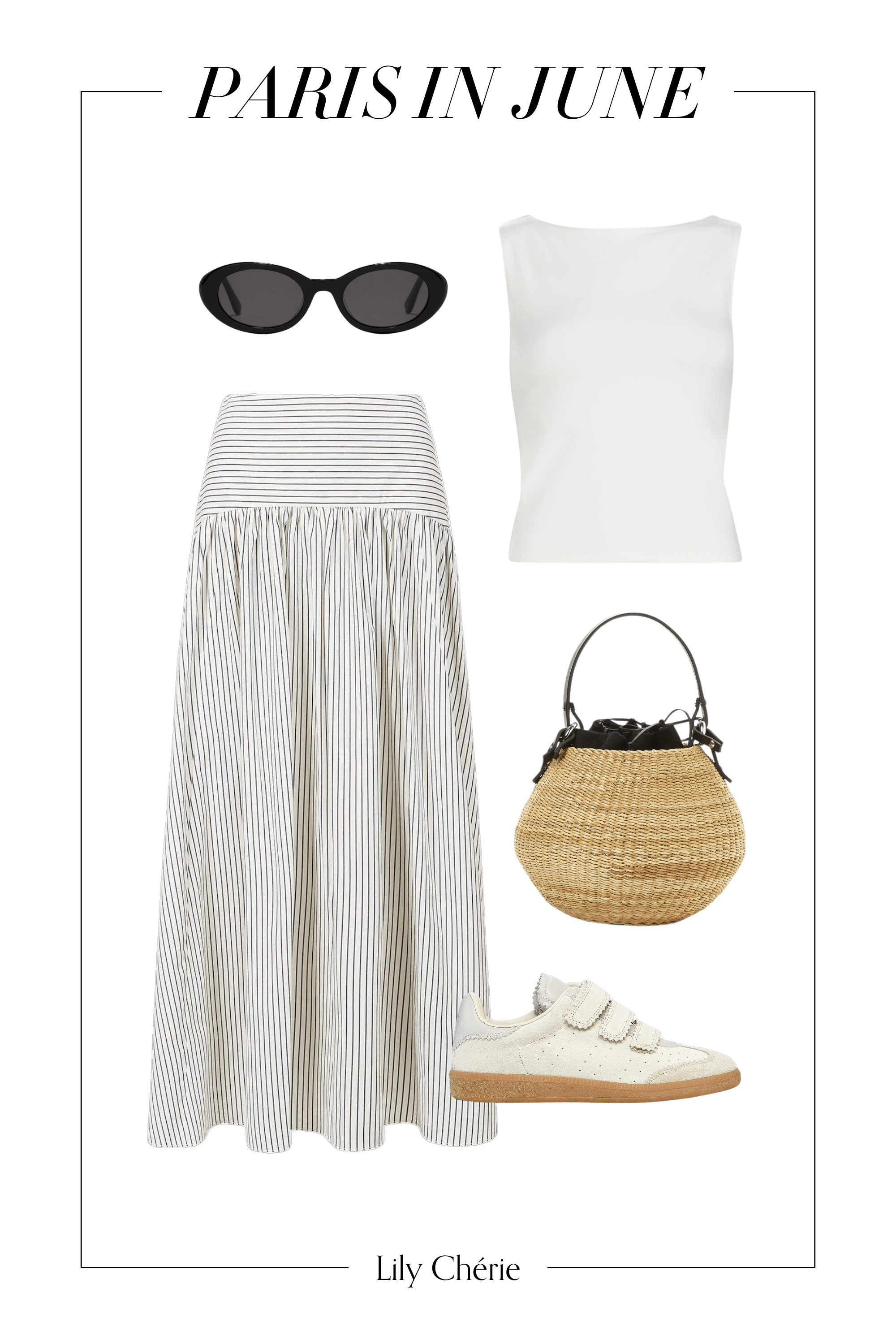 Tank top (similar) | Midi skirt | Basket bag | Sunglasses | Sneakers (similar)