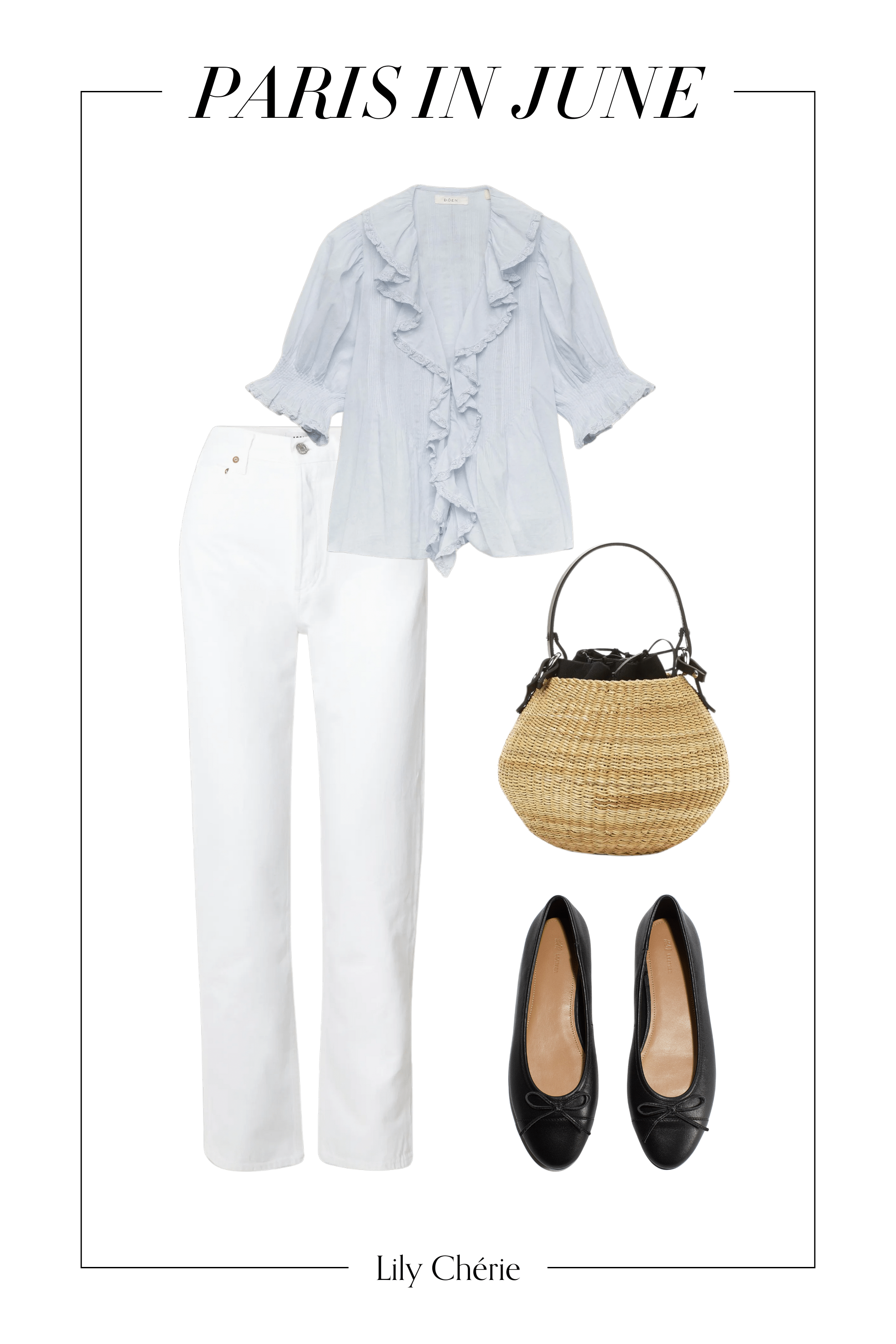 When planning what to pack in Paris in June, a few feminine blouses are a must. With Dôen being a major brand to shop this season, you’ll find no shortage of romantic options that feel perfectly Parisian. Their Henri Top (similar) is especially popular right now. I, too, love all of the ruffles and lacey trim.
