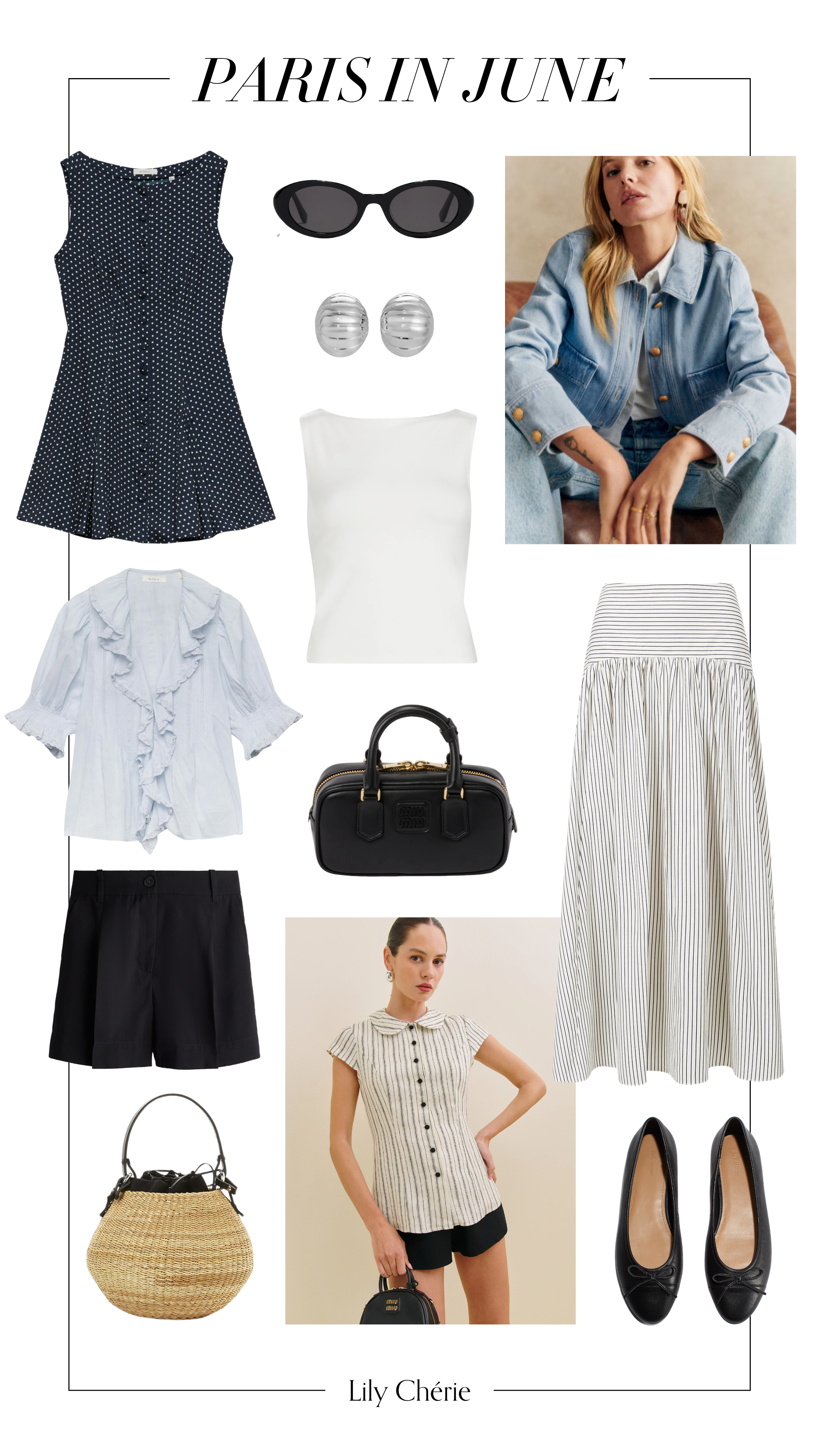 Mini dress (similar) | Sunglasses | Denim jacket | Earrings (similar) | Tank top (similar) | Ruffled blouse (similar) | Skirt | Mini bag (similar) | Shorts | Basket bag | Striped shirt (similar) | Ballet flats
