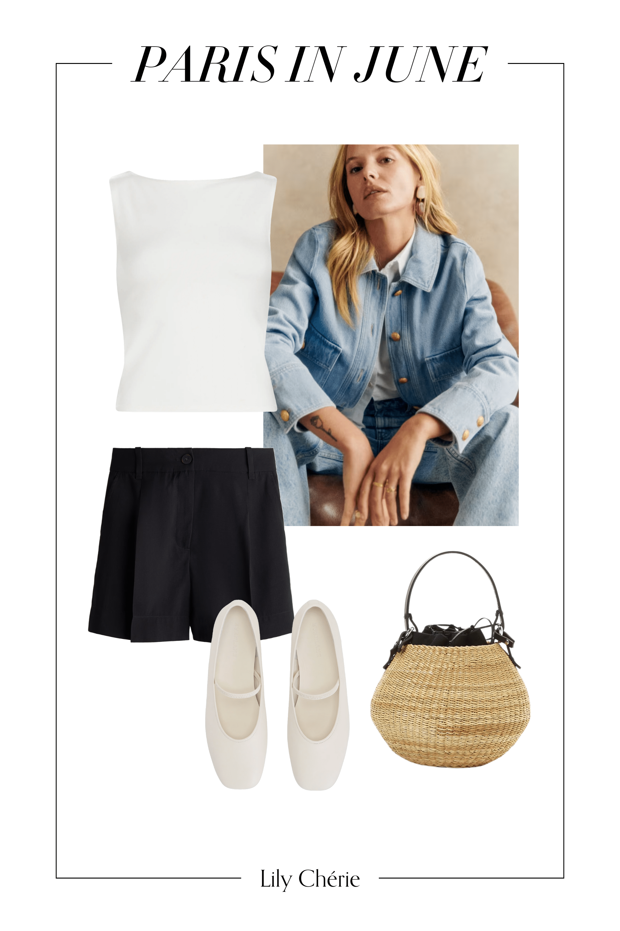 Denim jacket | Tank top (similar) | Shorts | Basket bag | Mary Janes