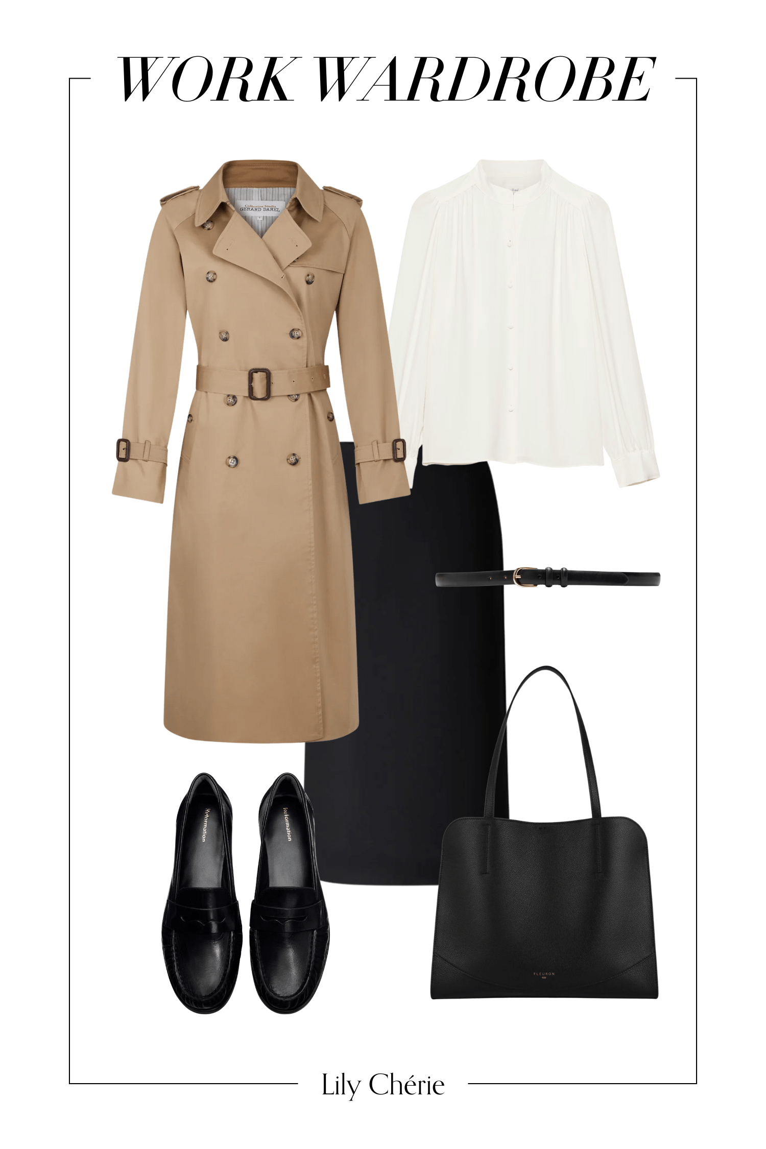 Trench coat. A true wardrobe icon, the trench coat is especially perfect for workwear. Once the temperatures drop, swap it for a long wool coat to stay warm with the same polished silhouette.