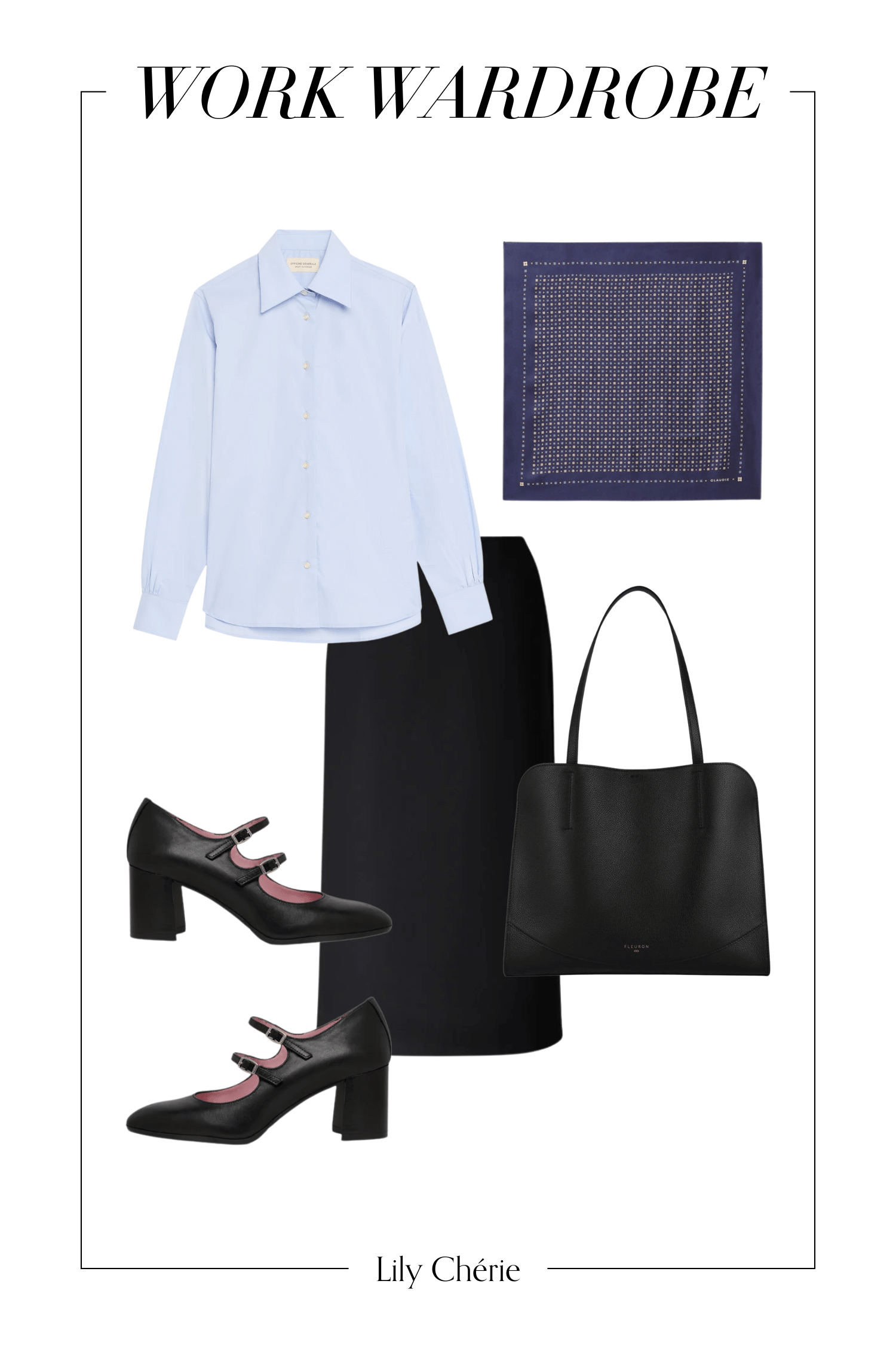 Light blue button-up shirt. A classic button-up in white or light blue is the backbone of workwear. Look for a tailored fit that tucks neatly into skirts or trousers and layers under blazers or cardigans.